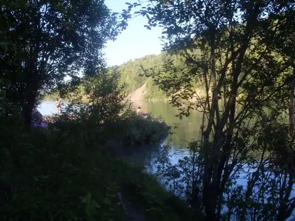 Мы спустились к воде. День был жаркий, середина августа, поэтому берег был забит отдыхающими. Кто-то катался на водном мотоцикле и взбаламутил всю воду, поэтому разглядеть дно даже возле самого берега нам не удалось. Мы прошли вдоль берега вправо. Там обнаружили вполне милую бухточку. Берега с двух сторон были крутые, но не особо высокие, народ карабкался по ним и прыгал в воду.