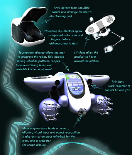 Бот Butl-R – это футуристический робот-кухонный помощник. Он спроектирован на базе быстро реагирующего искусственного интеллекта и инновационных передовых технологий. Робот снабжен практически человеческими руками, камерами и усовершенствованными сенсорами, системой подвижных вентиляционных элементов, и многими другими функциями. Применяя на деле все эти полезные утилиты, робот может готовить блюда, принимать заказы и собирать использованную посуду. Он даже может взаимодействовать с кухонными приборами благодаря компактной форме (размах «рук» всего 35 см) и способен работать практически в любых условиях. Этот функциональный кухонный помощник позволит деловым и постоянно напряженным пользователям будущего уделять больше времени развлечениям или работе.
