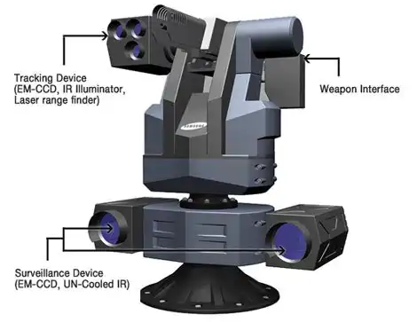 Федор Жидомиров, региональный менеджер отдела профессиональных систем безопасности компании Samsung Techwin в России и странах СНГ: "Я сам видел это устройство в действии -- впечатления замечательные! Казалось, что меня, как инженера, много работавшего с системами Pelco Esprit и ExSite, трудно чем-либо удивить. Однако "робот" действительно превосходит все ожидания. Две соосные независимые поворотные платформы расположены одна над другой. Нижняя оснащена двумя камерами (стандартной типа день/ночь высокой чувствительности и высокого разрешения и тепловизионной) и используется для круглосуточного и всепогодного наблюдения. Верхняя оснащена модулем автоматического сопровождения обнаруженного объекта и автоматической винтовкой для уничтожения нарушителей. Но самое интересное -- все это реально работает! Такие устройства уже используются в ряде стран для охраны государственной границы."