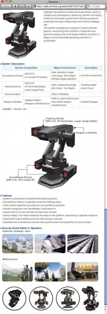 Более двух лет назад в отраслевой прессе появились многочисленные ссылки на ПР-материалы компании-производителя, сопровождаемые цитатами из публичных высказываний чинов южнокорейского Министерства обороны: "Суть проекта состоит в том, чтобы передоверить миссию наблюдения и охраны границы системе, состоящей не из живых солдат, а из роботов. Прежде чем внедрить устройство в практику, мы должны еще всесторонне рассмотреть требования, предъявляемые к боевым свойствам прибора." (Шин Хьюн-дон, спикер Минбороны Южной Кореи, в интервью газете The Korea Times). Сообщалось также и о том, что роботы с успехом прошли боевое крещение в Ираке, осуществляя автоматизированную охрану мест базирования южнокорейских подразделений.