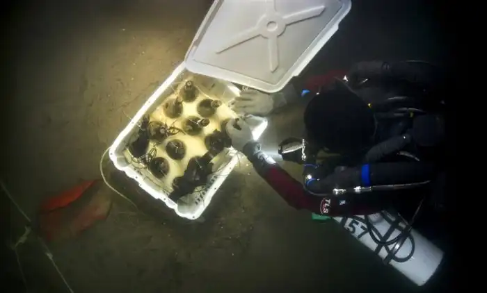 Менеджер музея Аландских островов Вивека Лоендаль демонстрирует шампанское, поднятое со дна балтийского моря.