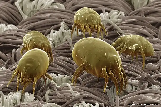 Пылевые клещики - это микроскопические, похожие на пауков существа, живущие в кроватях, коврах и мягкой мебели