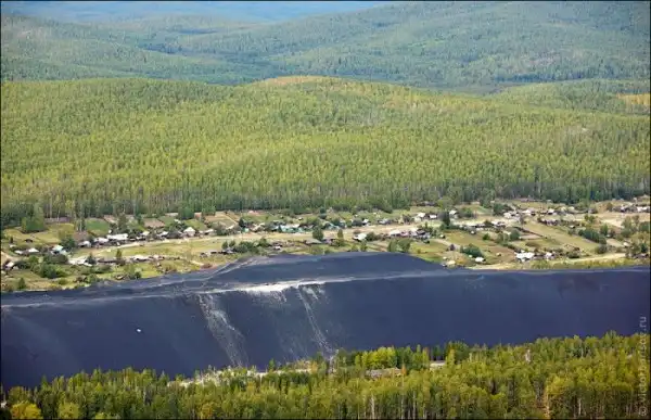 После переработки породы остаются тысячи тонн шлама. Его сваливают недалеко от завода. В результате образуются вот такие терриконы.