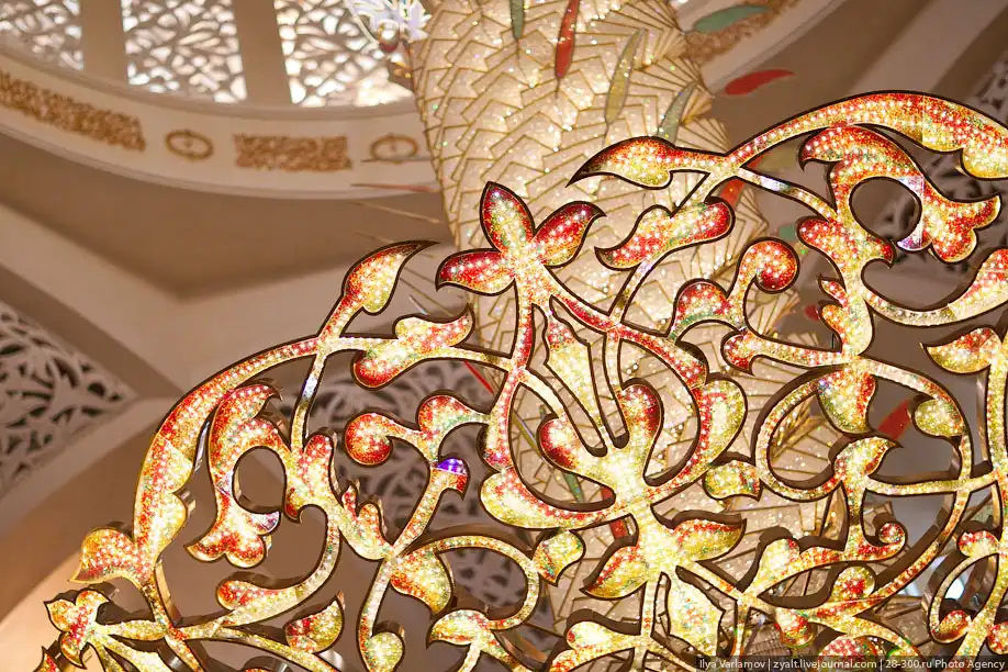 В мечети висит самая большая люстра. Семь медных позолоченных люстр были импортированы из Германии. Самая большая люстра имеет 10-метровый диаметр и 15-метровую высоту. Впереди также видна стена Кибла. Она имеет высоту 23 и ширину 50 метров и искусно украшена таким образом, чтобы не отвлекать молящихся. 99 имен (качеств) Аллаха представлены на стене Кибла с использованием традиционной каллиграфии Куфи.