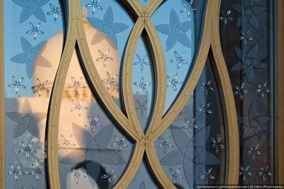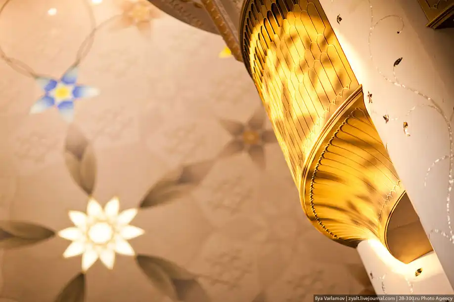 Для украшения интерьера использовались белый итальянский мрамор, 24-каратное золото, полудрагоценные камни – лазурит, красные агаты, аметисты, раковины моллюсков, горный хрусталь, натуральный жемчуг.