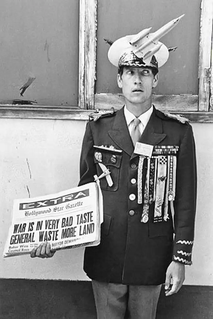 Пацифист со стажем в придуманной им униформе с наградами. Этот молодой человек протестует против войны во Вьетнаме и держит газету «Экстра». Заголовок газеты представляет собой каламбур на имя главнокомандующего армией США генерала Уэстморлэнда. (© Dennis Stock/Magnum Photos)