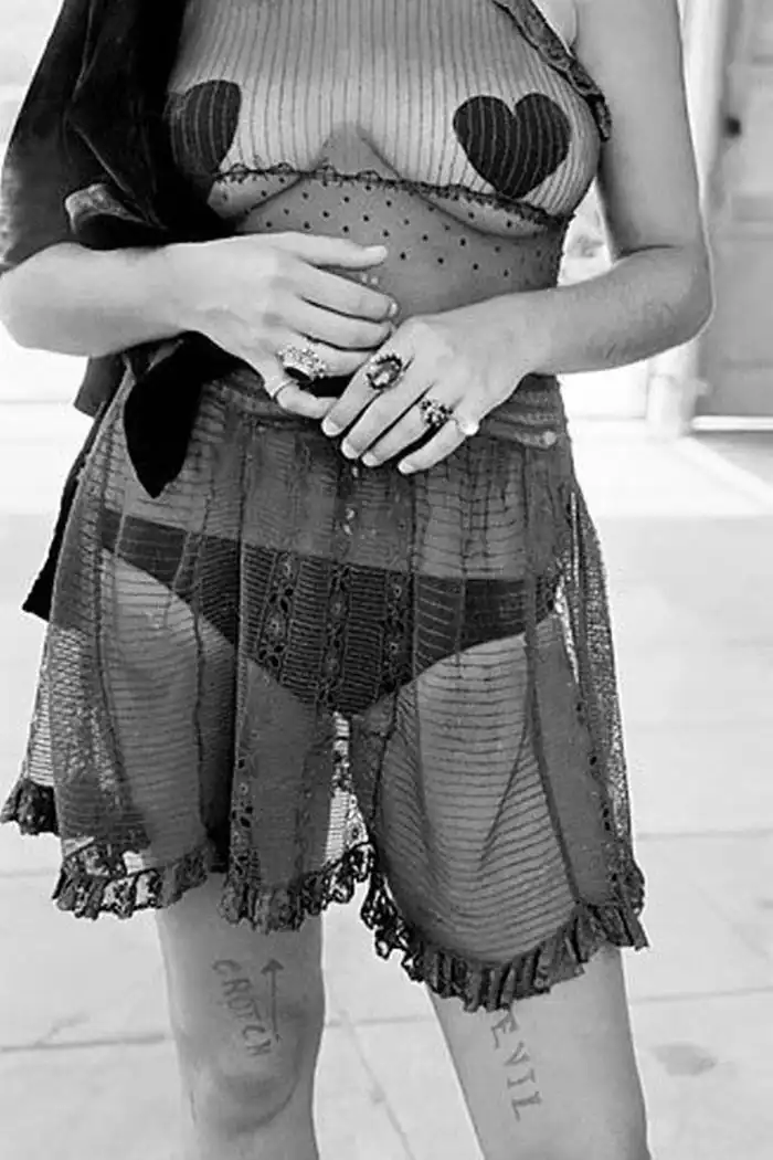 Хиппи всегда делали акцент на сексуальности. В начале 60-ых годов на рынках появились противозачаточные средства, способствовавшие распространению секса. Это послужило основанием для возникновения идеи свободной любви, которую активно пропагандировали в Калифорнии. Эта девушка нарисовала на ноге стрелку, указывающую на ее гениталии. Рядом написано «влагалище» и «злой». Такими надписями и столь откровенной одеждой она шокировала окружающих. (© Dennis Stock/Magnum Photos)