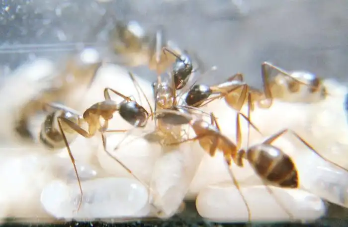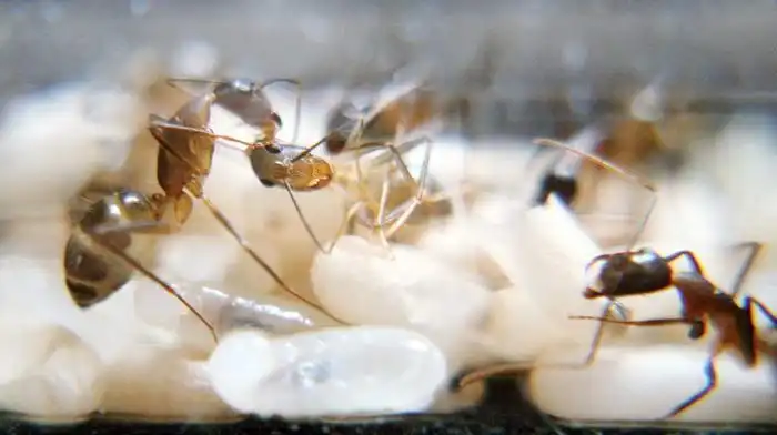 пройдёт еще несколько дней, пока маленький муравейчик полностью окрасится и научится хорошо ухаживать за расплодом, ворочать, облизывать и кормить личинок, и может быть несколько месяцев пока он наконец сможет выходить из гнезда чтобы доить тлю и охотится. а пока он сидит в гнезде и учится.