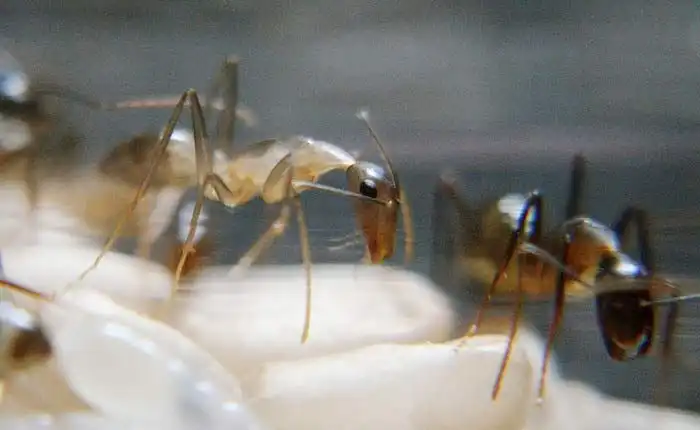 и вот, он пошел! новорошденные муравьи еще не умеют ходошо ходить, они шатаются, путаются в ногах и постоянно падают, совсем как новорожденные телята или оленята. но через несколько часов он уже будет хорошо бегать.