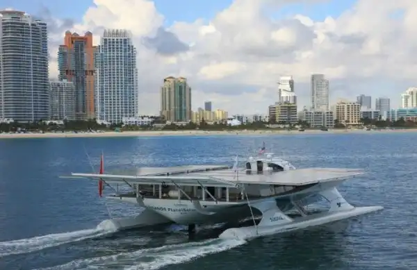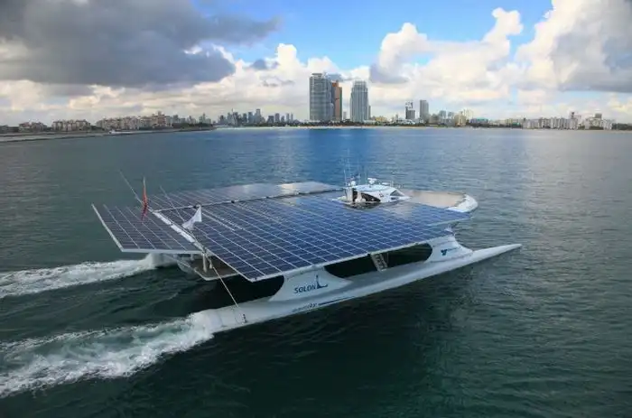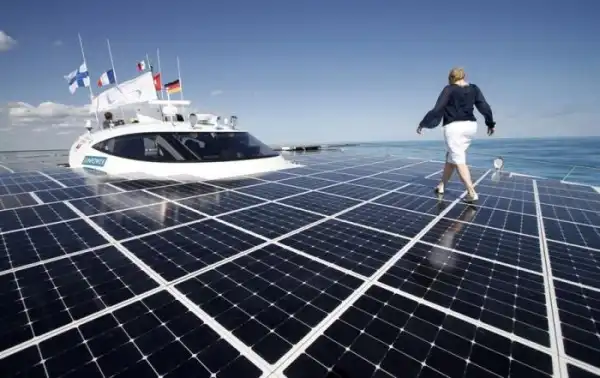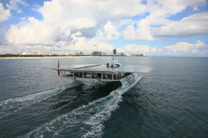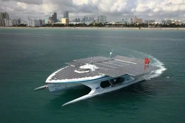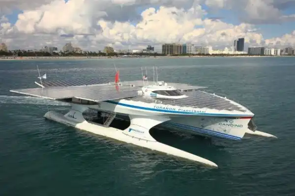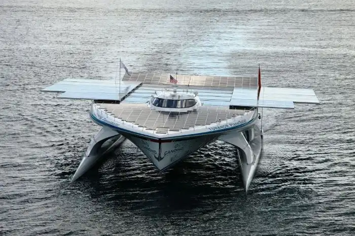 Немецкий искатель приключений Рафаэль Домьян планирует совершить кругосветное путешествие на крупнейшей в мире лодке, работающей от солнечных батарей. 85-тонный катамаран работает на солнечных батареях, он экологически чистый и абсолютно бесшумный на ходу. Длина судна - 31 метр, ширина - 16 метров. Площадь поверхности солнечных 38 000 фотоэлектрических панелей, обеспечивающих электроэнергией двигатели корабля - 500 квадратных метров. Катамаран может двигаться в устойчивом темпе со скоростью 7.5 узлов.