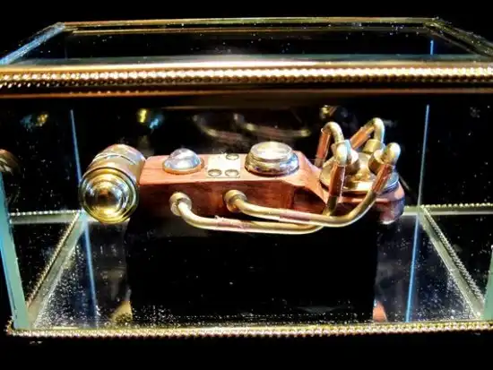 Корпус этой флэшки ручной работы изготовлен из палисандрового дерева и украшен четырьмя латунными трубками, а также кабошоном, выполняющим роль индикатора занятости устройства. На создание имитации измерительного прибора, прикрытого выпуклым стеклом, пошла часовая стрелка. Здесь есть даже крошечная табличка с выгравированной подписью создателя (Will Rockwell) и датой (2010). Емкость флешки – 16 ГБ. Если девайс пришелся вам по душе, то готовьте 350 американских рублей.
