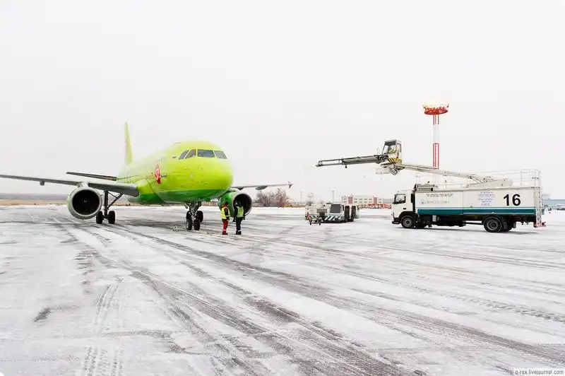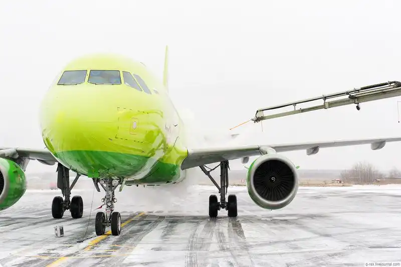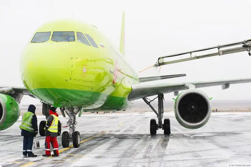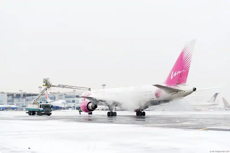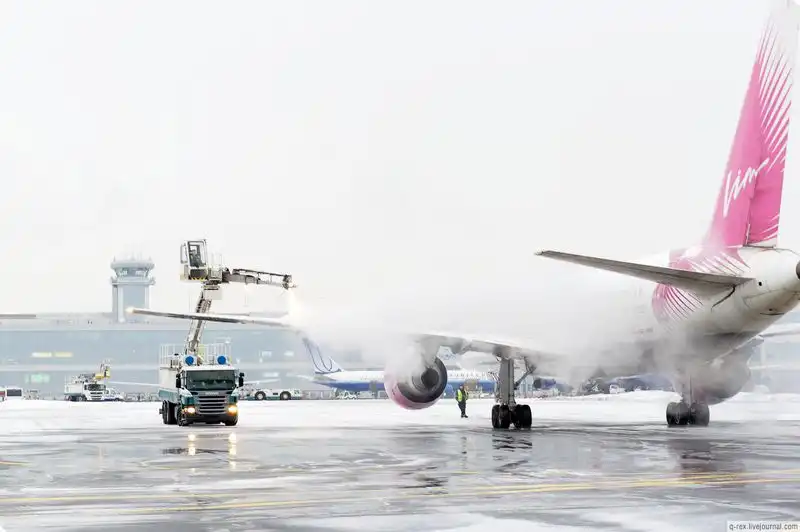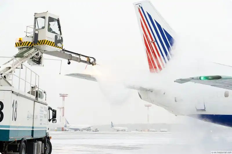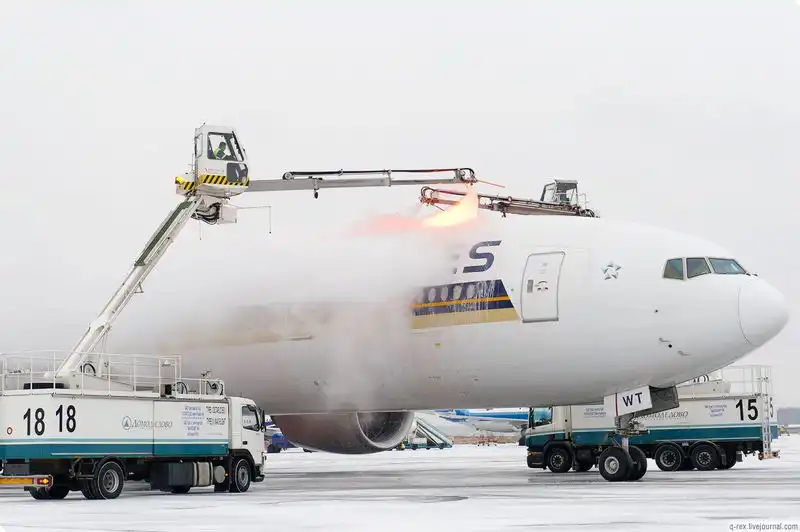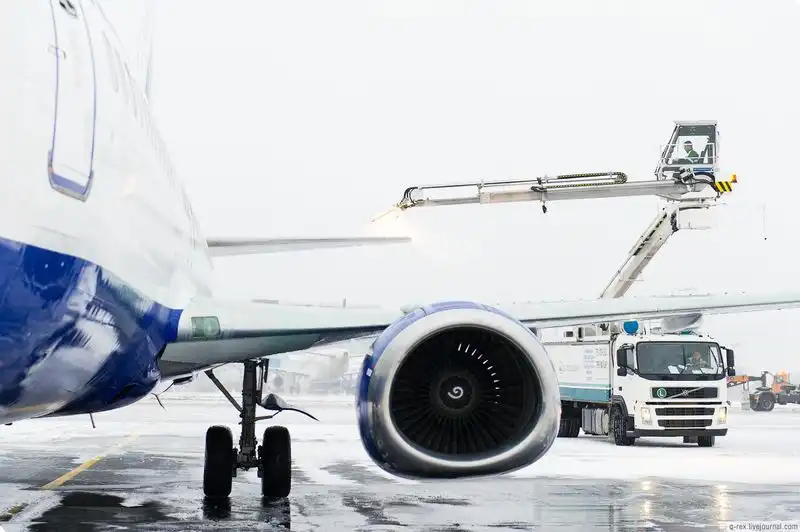 2. Если говорить техническим языком, то деайсинг (или, по-нашему, противообледенительная обработка воздушного судна) — это процедура очистки аэродинамических поверхностей от налипшего снега и образовавшегося инея и покрытие их защитным составом. Если по-простому — «поливают самолёт всякой гадостью».