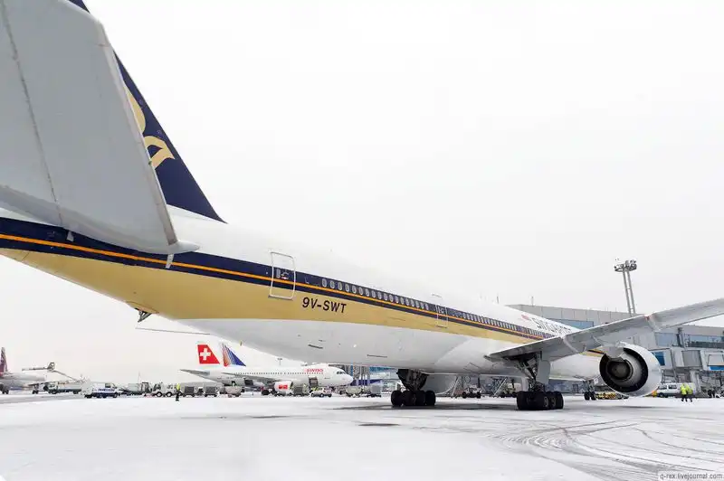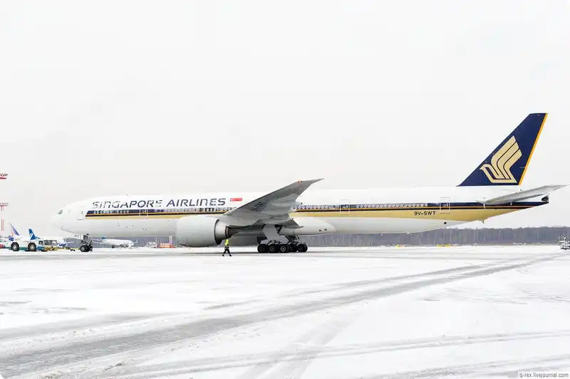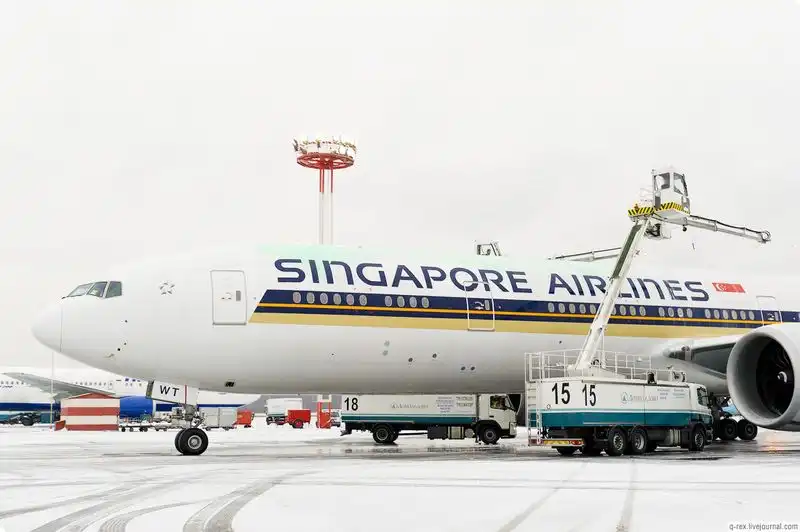 7. Деайсинг — одна из самых зрелищных процедур в авиации, особенно если речь идёт о лайнере-гиганте вроде этого Боинга-777 Сингапурских авиалиний.