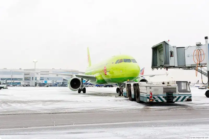 10. Кстати, о них. Второй самолёт, на примере которого мы будем смотреть обработку — сибирский Аэробус А319. Посадка закончена, трап сложен и начинается руление к открытой площадке.