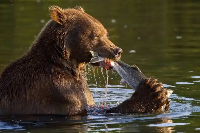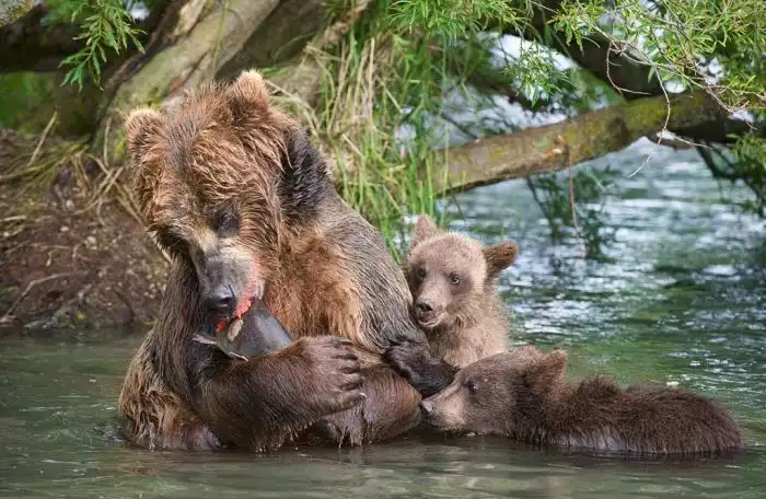 Голодные медведицы очень неохотно делятся рыбой со своими малышами, лишь только по мере насыщения они начинают им оставлять недоеденные головы. Слишком настойчивым и требовательным медвежатам может достаться и материнский подзатыльник, но сытая медведица добродушна и готова отдать целого лосося.