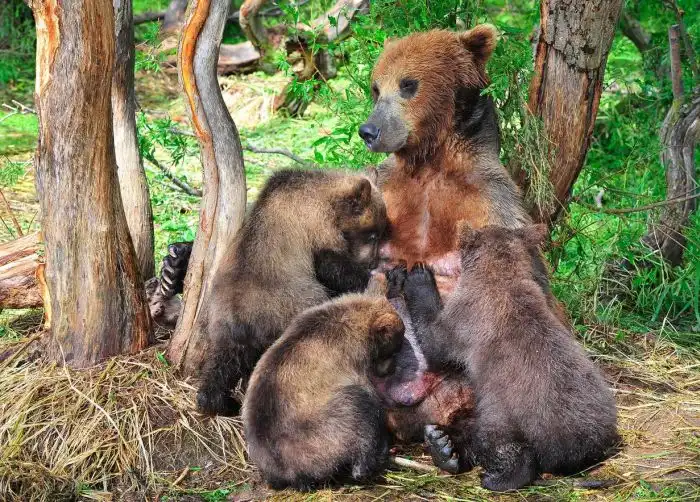 Даже в самые безрыбные годы в Курильское озеро заходит столько лосося, что местная популяция медведей всегда нагуливает достаточную массу перед залеганием в зимнюю спячку. В силу этого у местных медведиц очень часто рождается три, а то и четыре медвежонка.