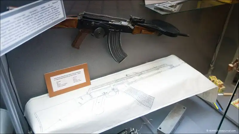 3. В многочисленных нарядно застекленных витринах демонстируются архивные чертежи, опытные образцы оружия разных годов, немецкое и другое импортное оружие (беспощадно поступавшее на отечественные заводы с целью кописпасты наиболее удачных узлов и решений). В отдельных витринах - тонны поделок и выдумок Михаила Тимофеевича, а также подарки и сувениры, которые ему когда-то кем-то дарились, но в квартире для них уже нет места, видимо.