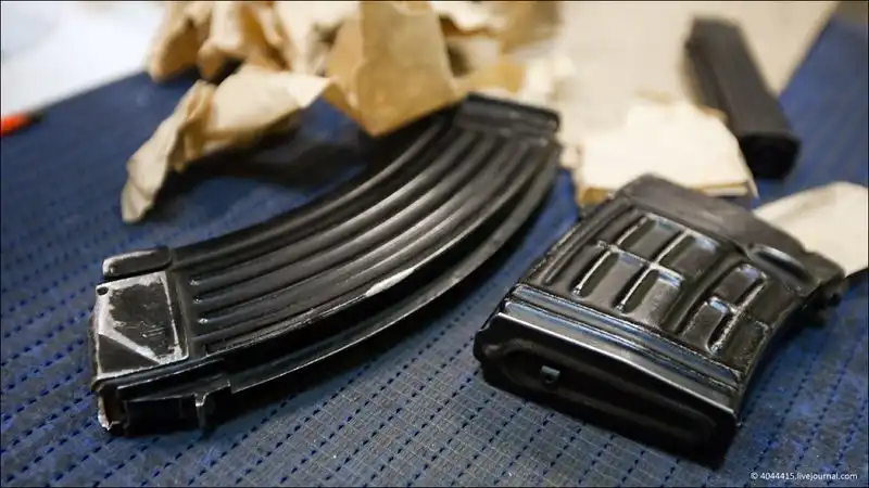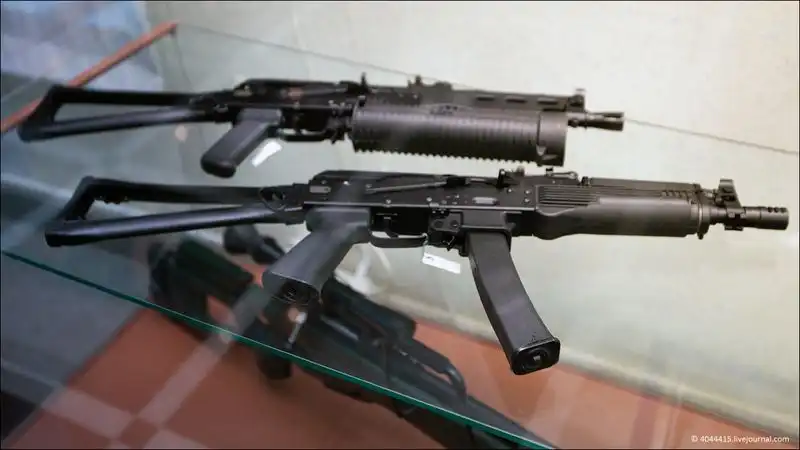 5. Несколько автоматов АКМ (7.62-мм): со складывающимся прикладом и ножом; с прибором бесшумной и беспламенной стрельбы (ПББС); пограничный вариант (для купания в фонтане 28 мая); ручной пулемет Калашникова; опытный автомат АЛ-2 (Автомат Легкий) (разрабатывался в 1964 году со схемой автоматики, размещенной в компоновке bull-pupp)