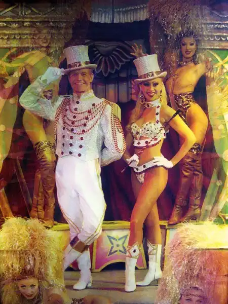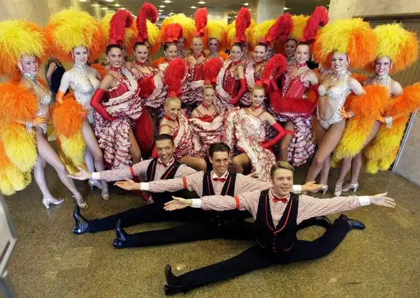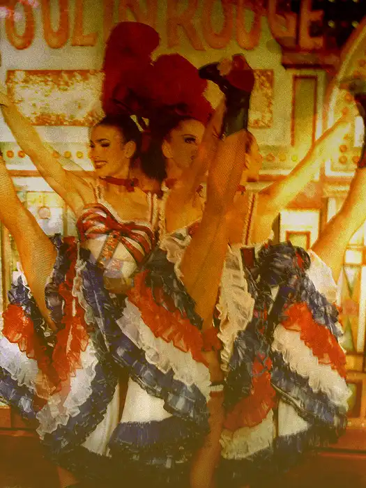 Создатели кабаре подобрали хорошую труппу танцовщиц, которые, вопреки сложившемуся впоследствии мнению, танцевали только одетыми, хотя и относительно фривольно. Вскоре все лучшие танцовщицы получили от посетителей прозвища, с которыми многие девушки вошли в историю. Например, Нини-Пат-ан-л'Эр (Нини – Лапки кверху), Жанна Авриль (Динамит), Рэйон д'Ор (Золотой лучик). Самой же известной танцовщицей того периода стала Луиза Вебер, получившая прозвище Ла Гулю (Обжора). Она и на самом деле любила хорошо поесть и выпить за счет посетителей, к которым охотно подсаживалась за столики. Благо, канкан – не балет, из-за лишнего веса партнер не надорвется, да и публике больше нравятся крепенькие девушки, на которых трусики и чулки не висят как на швабрах. Да и быть пикантной, но одновременно вульгарной и чувственной, без распирающей блузу крепкой груди – трудновато.