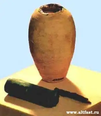 Этот артефакт нашли в 1936 г. в Ираке. Проводя земляные работы возле Багдада, строители нашли старинную могилу. Среди экспонатов, извлеченных из захоронения, особый интерес вызвал глиняный сосуд около 14 см в высоту с медным цилиндром, внутри которого выявили железный прут. Свинцово-оловянный сплав, которым был припаян цилиндр, используется и в наше время. Позже ученые установили – это батарейка. Но ее изготовили 15 веков назад.