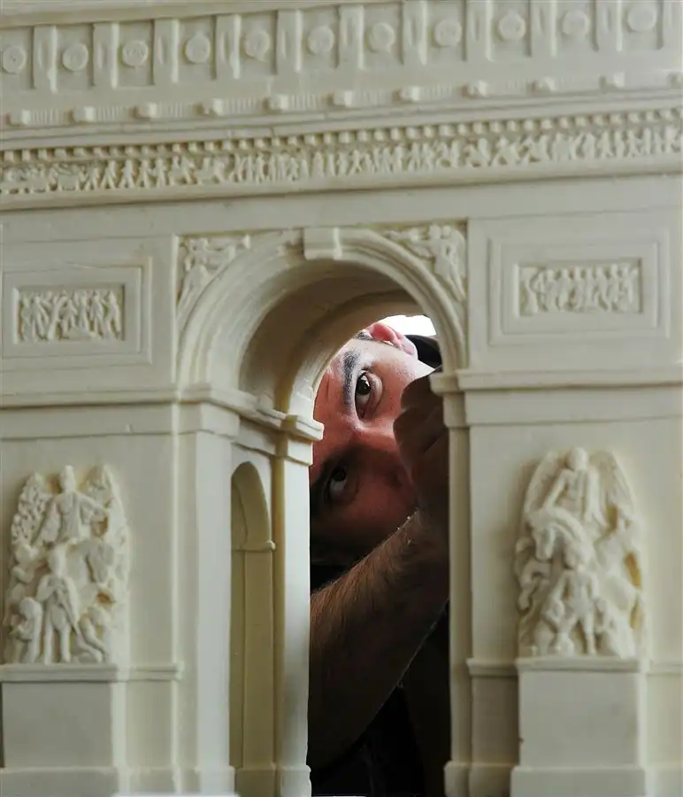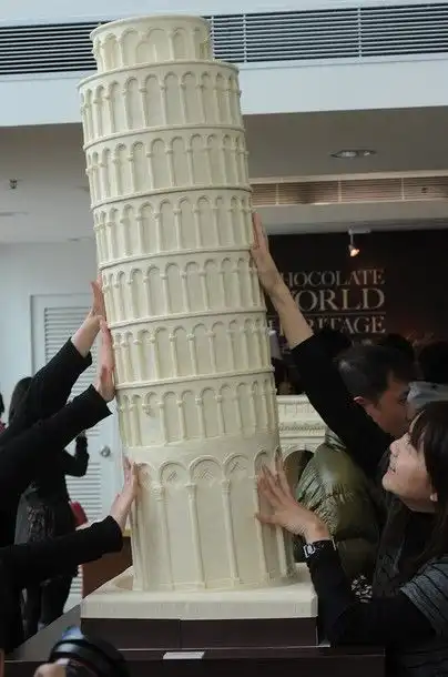 1. Итальянский шоколатье Мирко Делла Веккья заканчивает работу над копией Пизанской башни из белого шоколада. (Bobby Yip / Reuters)