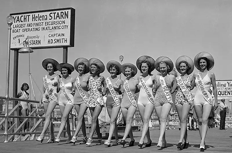 1. Первый конкурс «Мисс Америка» проводился в 1921 году отчасти в рамках мероприятий по привлечению туристов в Атлантик-Сити. Девять участниц представляли города, а не штаты. Победительницей стала 16-летняя Маргарет Горман (вторая слева) из Вашингтона. (Hulton Archive / Getty Images)