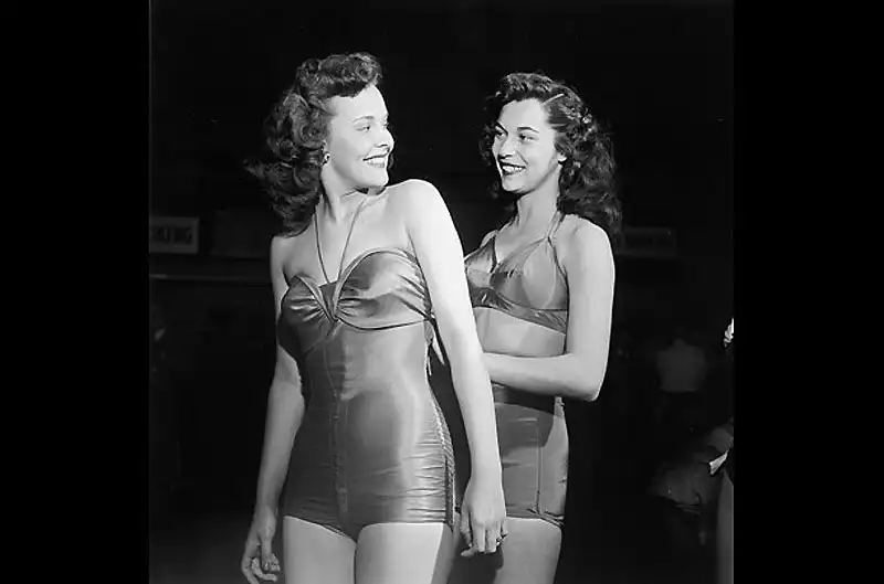 6. Две участницы помогают друг другу с купальниками на конкурсе в 1955 году, на следующий год после первого конкурса, транслировавшегося по телевидению. (Hulton Archive / Getty Images)