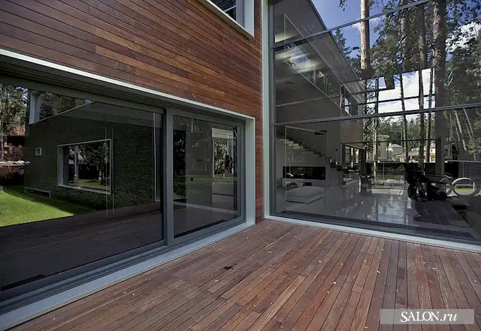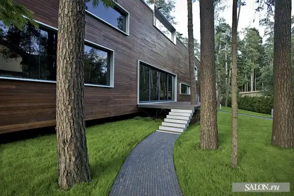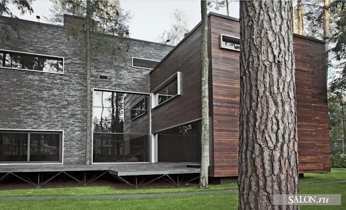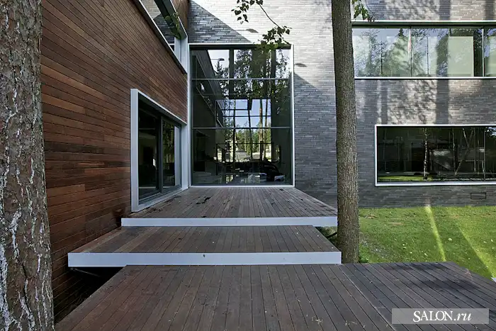 Фасад одного из объемов отделан темным деревом (ипе, или бразильским орехом), второго - клинкерным кирпичом. Дом не кажется громоздким, он органично вписывается в окружающий ландшафт