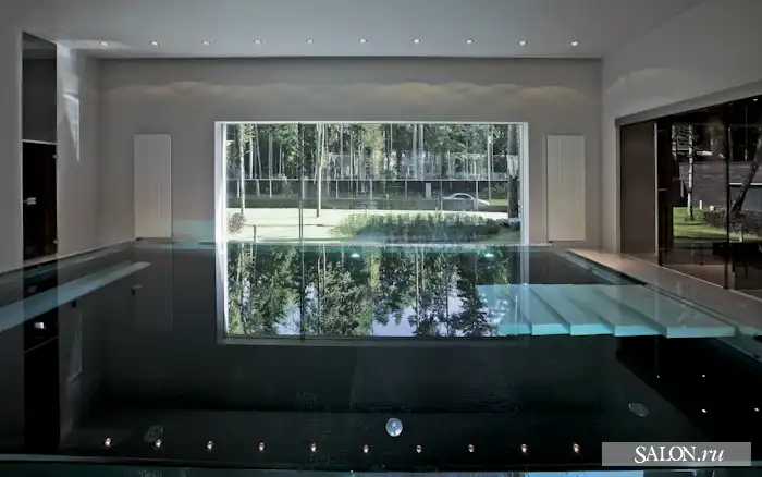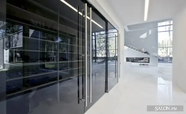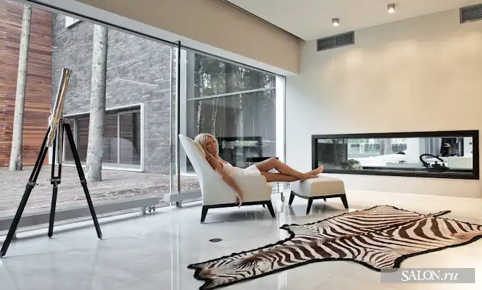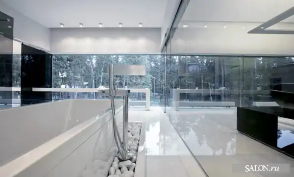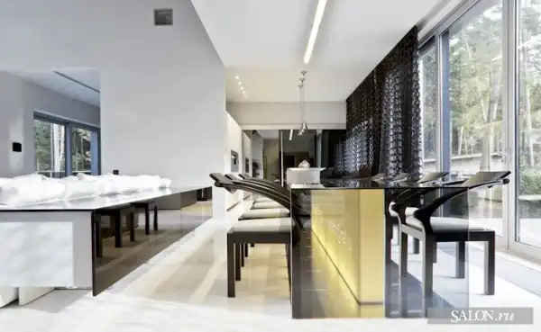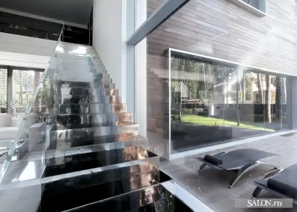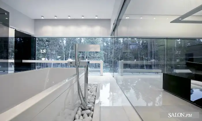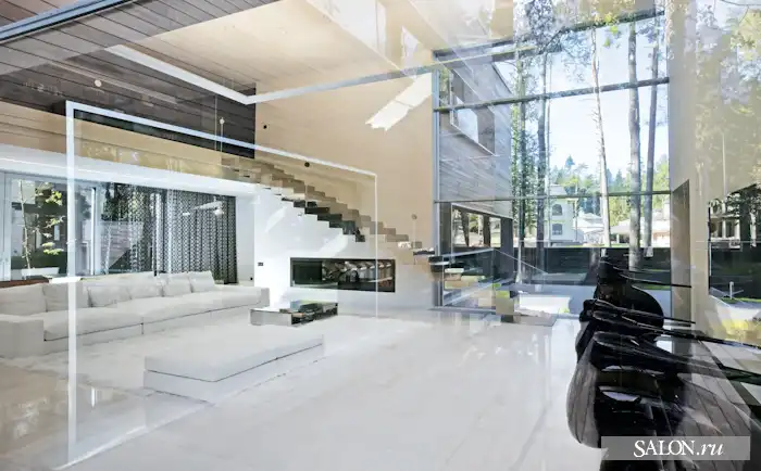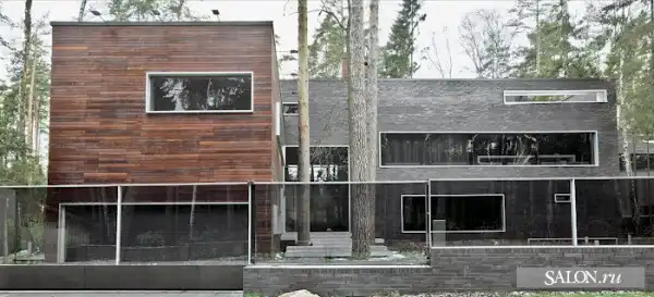 Загородный дом на Рублево-Успенском шоссе, новый проект московского архитектора Ивана Шалмина, состоит из двух пересекающихся объемов с разными фактурами. Интерьер и экстерьер взаимосвязаны, и природа становится как бы частью дома