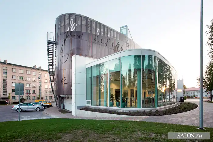 Эта мультимедийная библиотека в Вентспилсе (Латвия) - уникальное пространство. Во-первых, здесь нет ни одной лестницы. А на второй уровень можно подняться по спиральному пандусу. Вдоль него расположены стеллажи с книгами. Это было сделано прежде всего для людей с ограниченными возможностями. По всей библиотеке они могут передвигаться совершенно свободно. Во-вторых, все архитектурные элементы как бы перетекают один в другой и образуют единую несущую конструкцию. Фасад библиотеки облицован тонкой листовой медью. На эти панели нанесены фрагменты рукописи знаменитого латвийского фольклориста и писателя Кришьяниса Баронса.