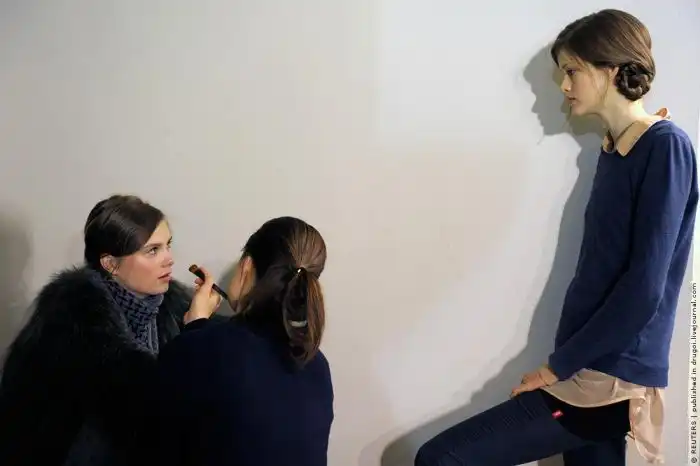 Гример встречает моделей еще у входа, наскоро гримируя их перед началом примерок одежды.