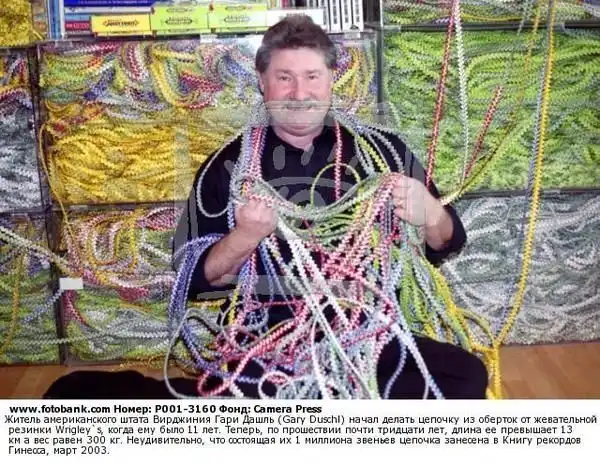 Книга рекордов Гиннесса сообщает о некоем Гари Дучле, который сплёл самую длинную цепочку из обёрток от жевательной резинки. Её масса составила 164,2 кг, а состояла она из 1 231 516 звеньев от 615 758 фантиков. Длина цепи — 9370,77 метра.