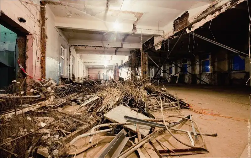 Разрушают стены, перекрытия - все что можно и то что осталось оставляют все там же. Кусочек проема слева, это лестница, из-за огромной дырке вы крыше полностью заваленная снегом.