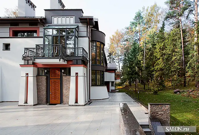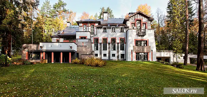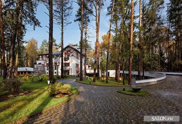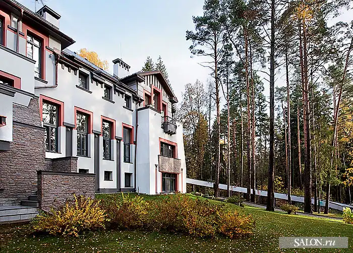 Этот дом, величественно стоящий в сосновом бору на полутора гектарах в одном из элитных подмосковных поселков, разительно отличается от зданий на соседних участках. Во внешнем облике угадываются черты средневекового замка, хоть и сильно осовремененного. Автор проекта Георгий Ставрианиди признает, что архитектурным прообразом действительно послужил собирательный образ старинных родовых домов-замков в готическом стиле.