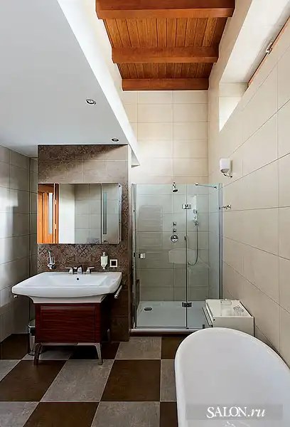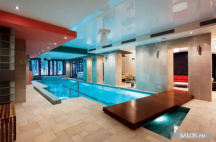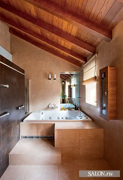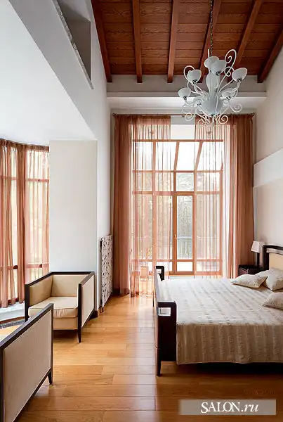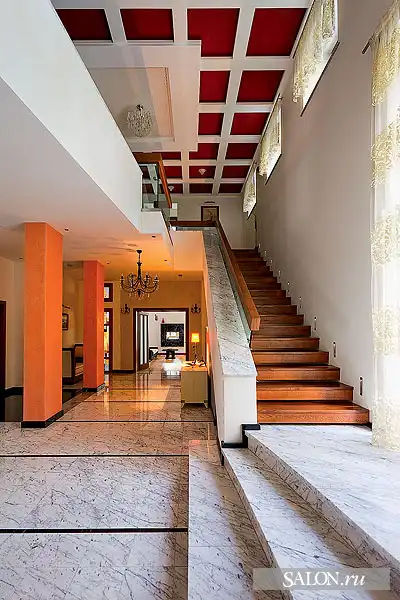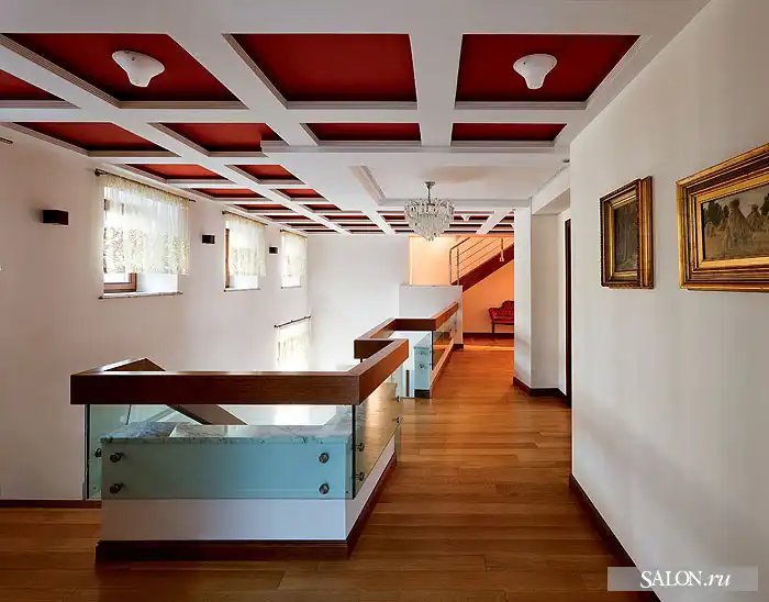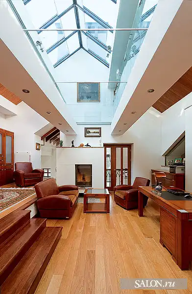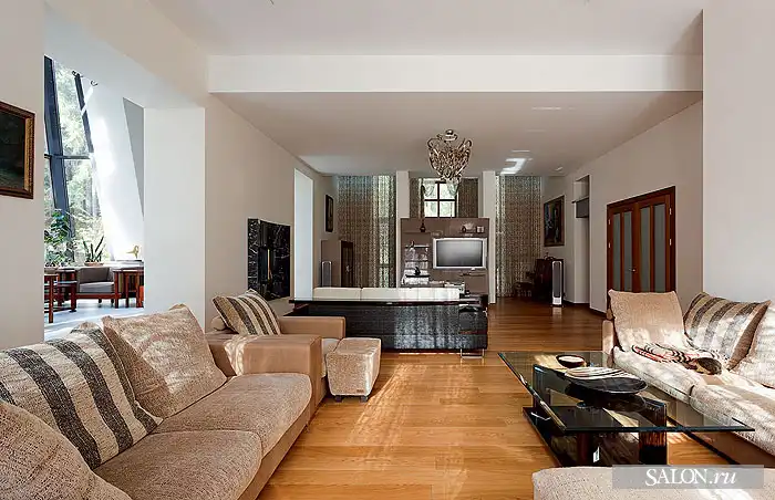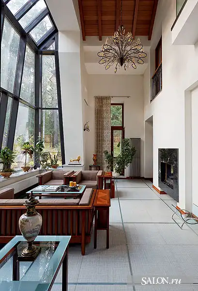 Взаимосвязан с архитектурой дизайн внутренних пространств. В интерьерах наряду с аллюзиями на тему замка используются приемы эклектики. Традиционные элементы (филенчатые двери, лепнина, деревянные стропила кровли и балочные перекрытия) и конструкции из стекла и металла, подвесные потолки, новейшая техника - все это по замыслу автора должно было создать атмосферу вневременного раз ви тия, где ни один из стилей не опознается впря мую. Этой же логикой Георгий руко вод ствовался при выборе мебели, светильников, предметов искусства. В частности, коллекция старинной живописи соседствует с настенной росписью по мотивам испанского художника- абстракциониста Хуана Миро, современной графикой и фотографиями. В целом архитектору удалось создать дом необычный, с яркой индивидуальностью и характером.