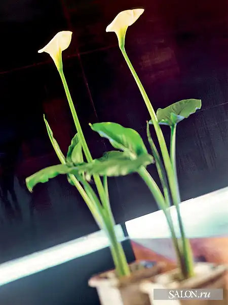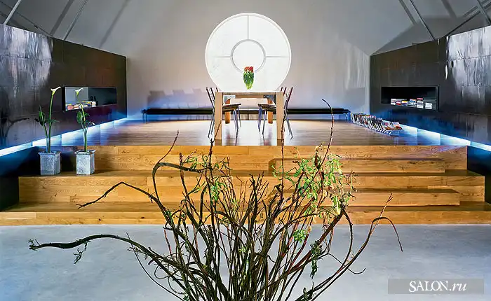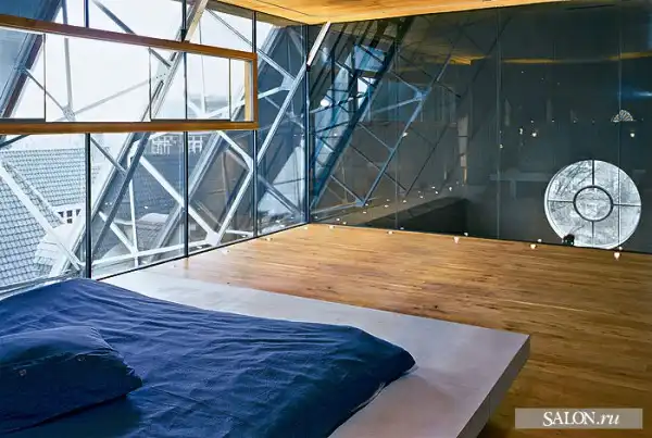 Громадное жилое пространство делится на зоны лишь условно. Все общественные помещения - кухня, гостиная, столовая - имеют открытую планировку. Столовую поместили на подиум, по сторонам которого стоят шкафы, обитые медными листами. С одной стороны, они служат разграничителями; с другой - не скрывают помещение полностью. За счет того что столовая поднята на подиум, отсюда просматривается весь этаж. Спальню же архитектор решил... подвесить над гостиной. Стеклянный короб, внутри которого находится спальня, стоит на четырех тонких металлических пилонах. Сквозь стеклянные стены отсюда видна вся остальная жилая зона. Из спальни же открывается потрясающий вид на центр Амстердама. Дело в том, что одну из стен здания полностью остеклили. К ней-то и примыкает короб. Внутрь можно попасть по лестнице. Лестничному пролету, кстати, также нашли применение: здесь находятся гардеробы и системы хранения.