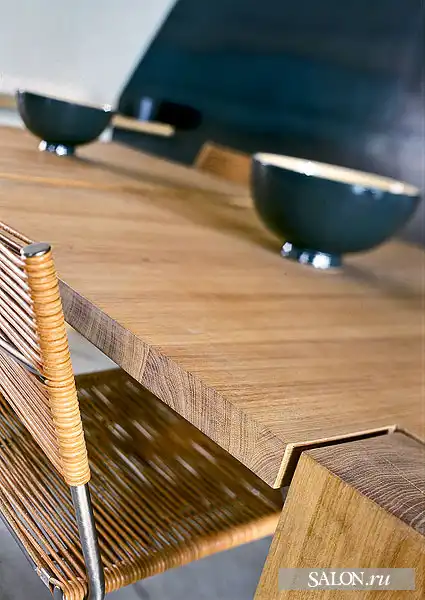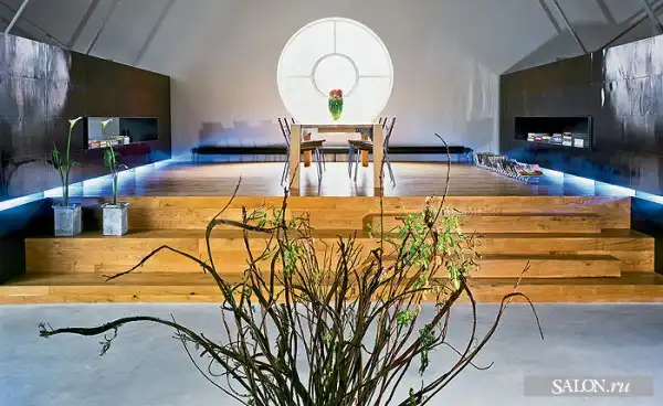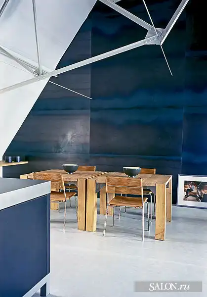 Интерьер лофта немыслим без трёх основных материалов - бетона, стали и дерева. Столовая поднята на деревянный подиум, по сторонам которого стоят шкафы для посуды, обитые медными листами. Особенно эффектно они смотрятся благодаря встроенной подсветке.