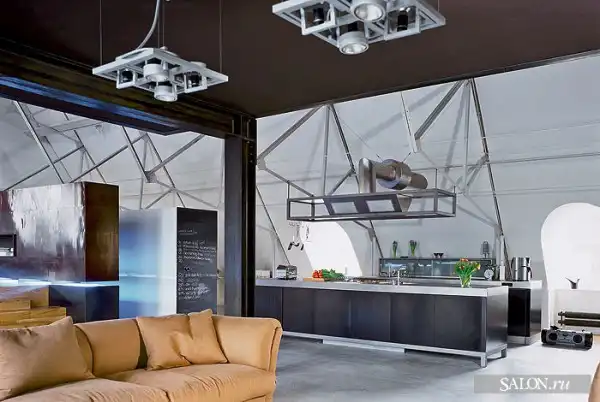Открытая кухня. Вытяжка крепится к стене с помощью сложной металлической конструкции.