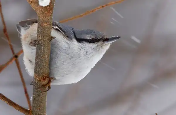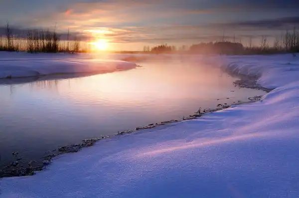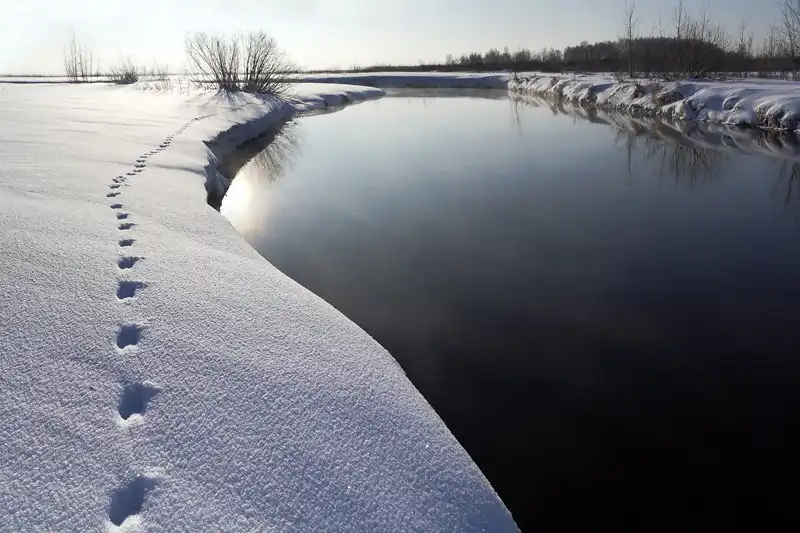 Морозно, клубиться пар от воды, норка прочертила строчку следов вдоль берега реки.