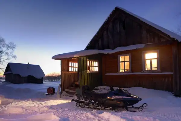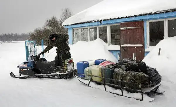 Базой выбираем умирающую деревню Ручьи, где находится кордон заповедника, в котором живут летом приезжающие исследователи и заглядывает для ночевок оперативная группа инспекторов охраны. Добраться до Ручьев можно только по большой воде или зимой, после того как замерзнет достаточно широкая река Страдница. Мост на реке разрушен уже несколько лет. Вот и образовался на озере Полисто такой медвежьий угол, за которым на полсотни километров ни жилых деревень ни власти никакой точно нет. А в этот новогодний праздник по недоразумению сгорела трансформаторная подстанция, поэтому электричества тоже нет и возможно, никогда уже не будет. Поэтому в нашу десятидневную экспедицию приходится все брать с собой - топливо, продукты, генератор и оборудование на нартах, прицепленных к снегоходу.