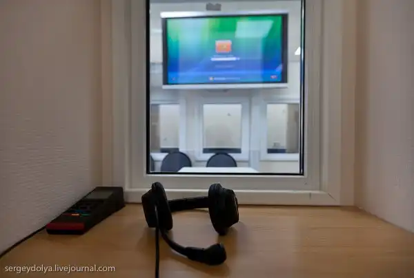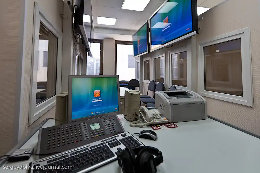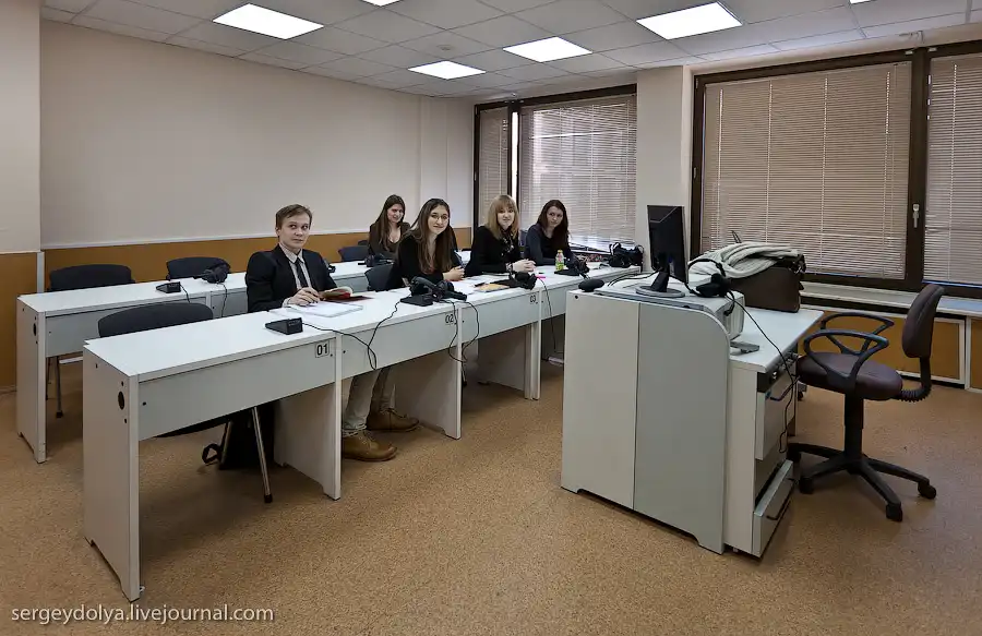 А это помещение для подготовки переводчиков-синхронистов. Занятия ведут специалисты МИДа. Учитель запускает какую-нибудь речь или фильм, а студенты, каждый сидя в своей кабинке, переводят: