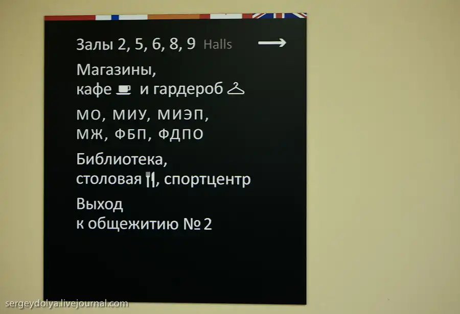 Для того, чтобы студенты не плутали в поисках нужной аудитории, все коридоры в МГИМО имеют свои названия, а на стенах висят навигационные подсказки:
