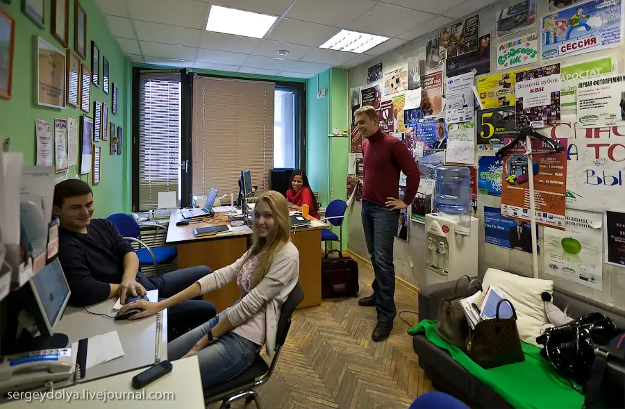 Естественно, все начинается с вешалки. Я ожидал увидеть девушек в норковых шубках, не видящих ничего перед собой, или юношей в элегантных костюмах от Дзинь и с золотыми Верту в руках, а вместо этого увидел абсолютно нормальных студентов, думающих в первую очередь об учебе, а не о своей пафосности: