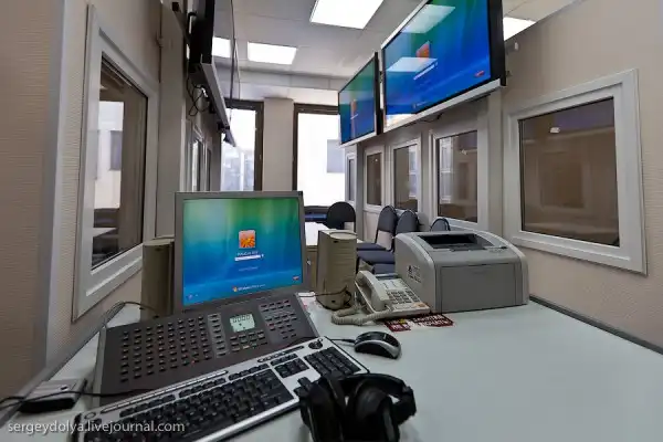 Мониторы подключены к компьютеру в аппаратной, с которого изображение транслируется еще и на большой экран: