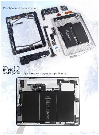 На иллюстрации слева представлен разобранный первый iPad, а ниже iPad 2.