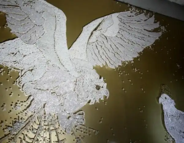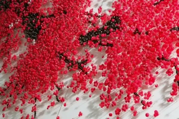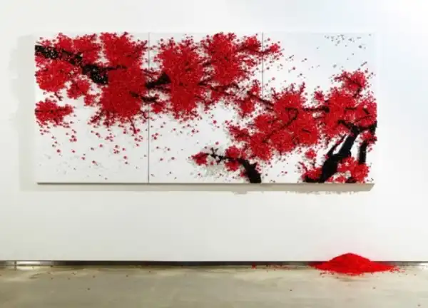Вместо того, чтобы использовать швейные принадлежности по назначению, корейская художница Ран Хван (Ran Hwang) заставляет с их помощью расцветать деревья. Для создания уникальных произведений искусства, Ран Хван забивает тысячи игл в стену, а затем развешивает на них пуговицы, получая в результате кропотливой работы изображения летящих птиц и цветущих деревьев. Работа осложняется тем, что ее можно оценить лишь издалека, в то время, как вблизи она выглядит размыто и нечетко.