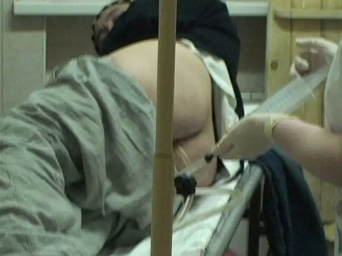 И сел на тазик. Все ждут. Часы тикают. Процесс не идет. Но тут, могучая медсестра, простая русская девушка, которой надоело ждать, скомандовала: