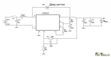 Данную схему удобно размещать в китайском фанарике, где стоит батарея из трех ААА(мизинчиковых) батаеек