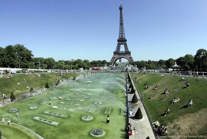 Туристы смачивают ноги в фонтанах на площади Трокадеро, вокруг которой расположено множество музеев и садов.
