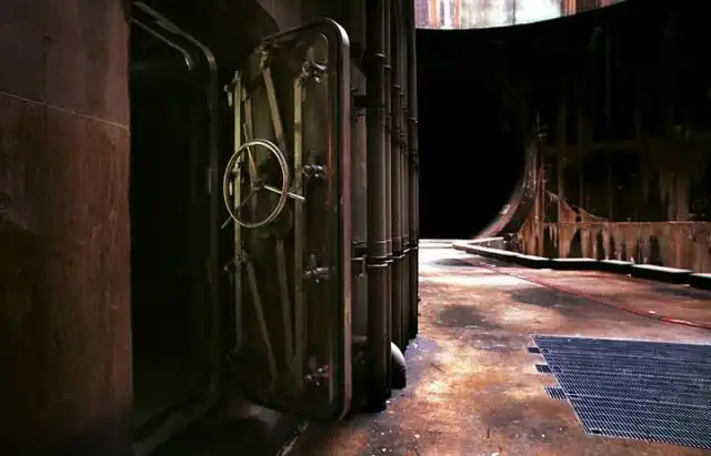 Телега, изображенная на этой фотографии, использовалась для транспортировки ядерных бомб в секцию загрузки. Следующее фото — «святая святых» — комната хранения ядерного оружия. Обратите внимание на прочные двери (весят 16 тонн каждая):